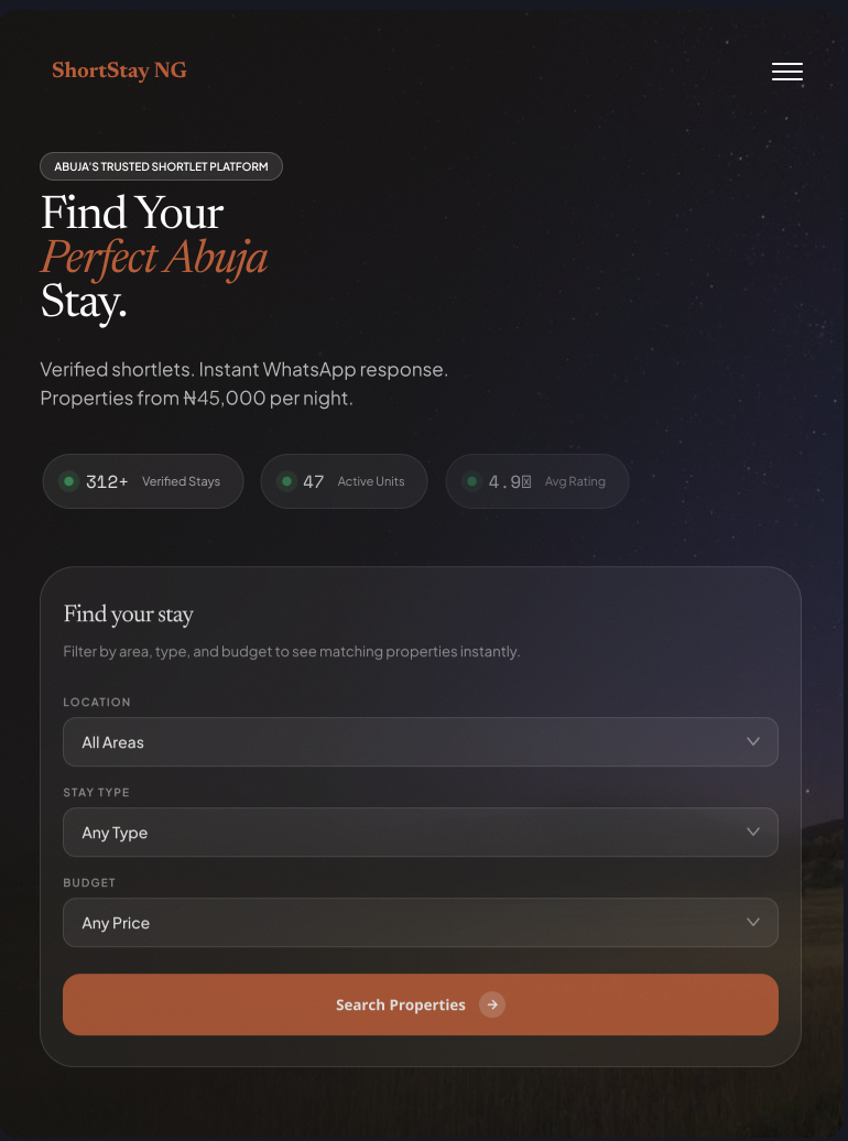 A shortlet and long-term rental website built for a fast-moving Abuja agency.