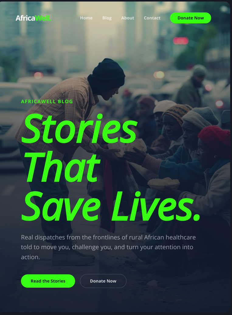 A content platform for AfricaWell NGO — real dispatches from the frontlines of rural African healthcare, built to move readers into action.